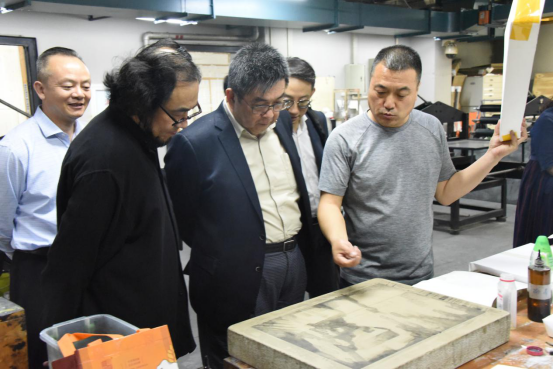 代表团一行参观了以版画实验室为主体的“国家级实验教学示范中心”,听取了造型艺术学院郑金岩院长、版画系主任郭鉴文副教授、雕塑系汤耀胜老师的专业建设情况介绍,并与学生进行互动交流。