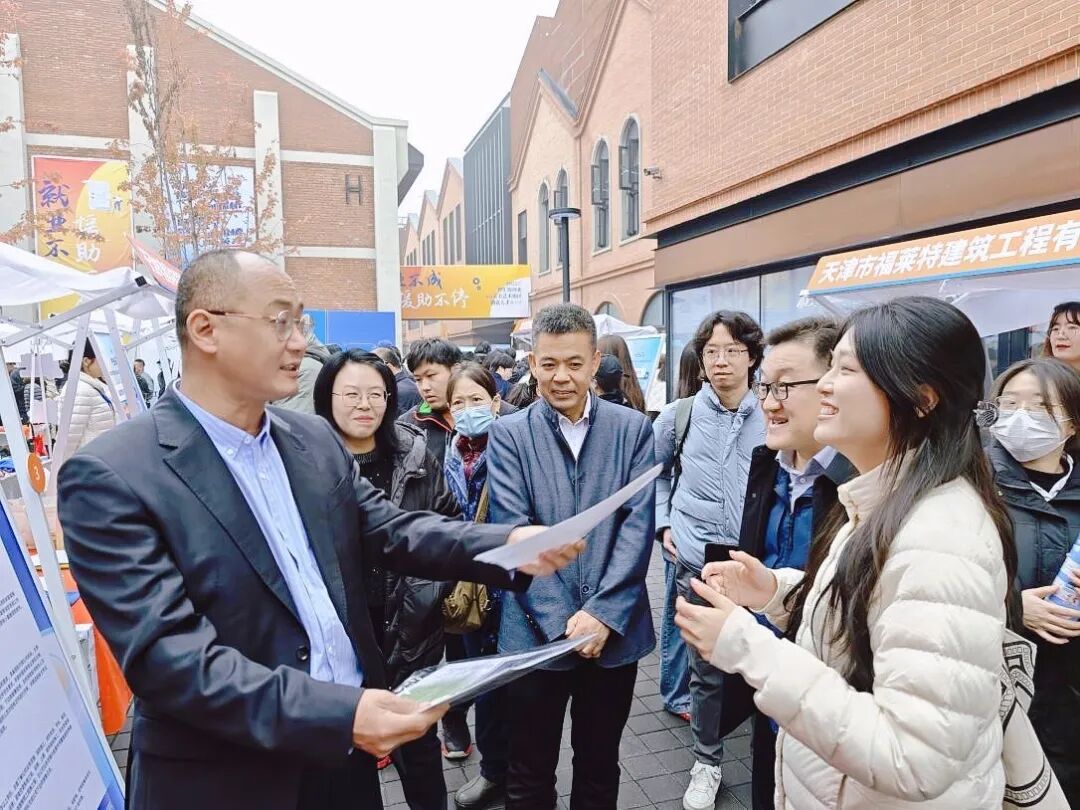 开幕式结束后,天津市人社局、河北区人民政府、beat365中文官网入口等单位的相关领导一同走进天美艺术街区活动现场,实地了解企业与学生的双向交流,感受推介会上的热烈氛围。