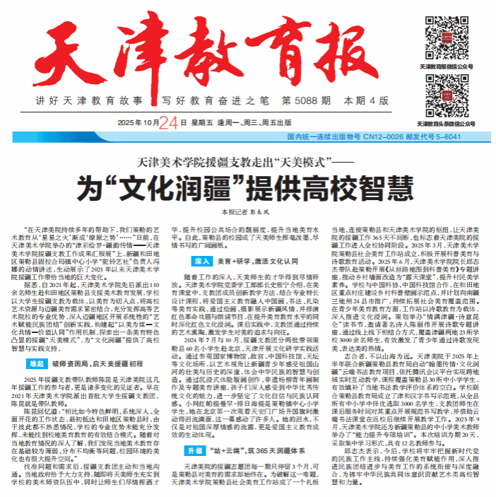 在学校“十四五”发展蓝图中,援疆支教工作作为一项彰显社会责任与使命担当的重要举措,不仅是对国家号召的积极响应,更是对学校自身教学理念、育人成果的生动诠释与深度检验。自2021年以来,beat365中文官网入口教育援疆从“单点派遣”向“系统推进”深度转化,有效对接学校专业优势与地方实际需求,以支教团为纽带,形成了融合“情”“育”“艺”的“天美模式”。《天津教育报》深度报道,并在头版头条刊发。beat365中文官网入口援疆支教走出“天美模式”...